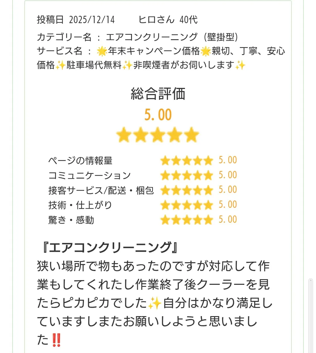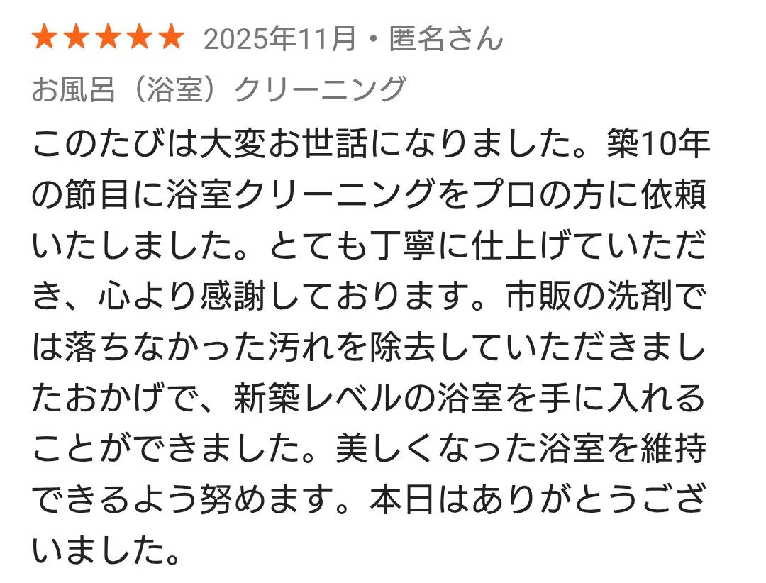 実際にハウスクリーニングをご利用いただいたお客様からの感想やご意見を紹介しています。清掃後の住まいの変化だけでなく、スタッフの対応や説明の丁寧さなど、安心して任せられたというお声を多くいただいており、サービスの励みとなっています。実際に寄せられたお声を参考にしていただき、清掃を依頼する際の目安や今後のプランを考える際の参考としてぜひご活用ください。